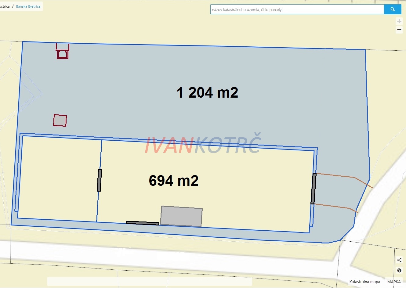 Zastavaná plocha skladu je 694m2 a okolitý pozemok má 1 204m2. Spolu je to 1 898m2.